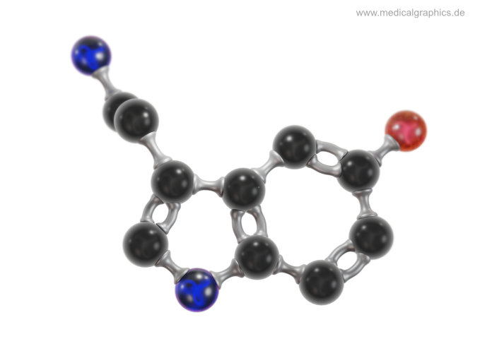 Serotonin in einer kostenlosen 3D Illustration als Kugel-Stab-Modell auf weißem Hintergrund. Serotonin ist ein Gewebshormon und Neurotransmitter im peripheren und zentralen Nervensystem. Als Neurotransmitter wird Serotonin im Gehirn gebildet und beeinflusst sowohl Wahrnehmung, Schlaf, Temperaturregulation, Sensorik, Schmerzempfindung und Schmerzverarbeitung, Appetit, Sexualverhalten wie auch die Hormonsekretion. Als Gewebshormon ist Serotonin unter anderem an der Gefäßverengung, Gefäßerweiterung, Erhöhung der Thrombozytenaktivität, Darmperistaltik und der Blutstillung beteiligt.