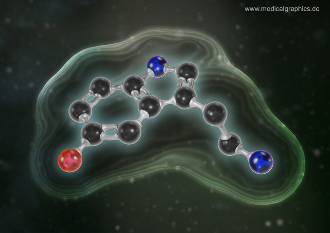 Serotonin in einer kostenlosen 3D Illustration als Kugel-Stab-Modell mit angedeutetem Oberflächenmodell auf grünem Hintergrund. Serotonin ist ein Gewebshormon und Neurotransmitter im peripheren und zentralen Nervensystem. Als Neurotransmitter wird Serotonin im Gehirn gebildet und beeinflusst sowohl Wahrnehmung, Schlaf, Temperaturregulation, Sensorik, Schmerzempfindung und Schmerzverarbeitung, Appetit, Sexualverhalten wie auch die Hormonsekretion. Als Gewebshormon ist Serotonin unter anderem an der Gefäßverengung, Gefäßerweiterung, Erhöhung der Thrombozytenaktivität, Darmperistaltik und der Blutstillung beteiligt.