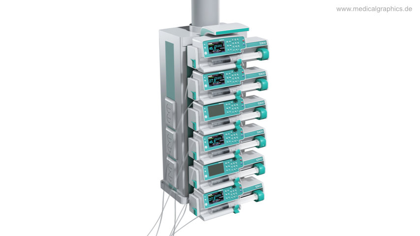 Illustration einer Spritzenpumpe für intravenöse und intraarterielle Infusionen sowie für die enterale Ernährung. Spritzenpumpen werden vor allem auf Intensivstationen eingesetzt und sorgen durch die kontinuierliche Abgabe für eine gleichbleibende Wirkstoffkonzentration im Blut. Auf einem integrierten Monitor können der Wirkstoff und dessen Abgabe vom Pflegepersonal überwacht werden.