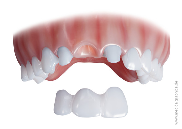 Illustration einer Zahnbrücke (Endpfeilerbrücke) an den Schneidezähnen des Oberkiefers.