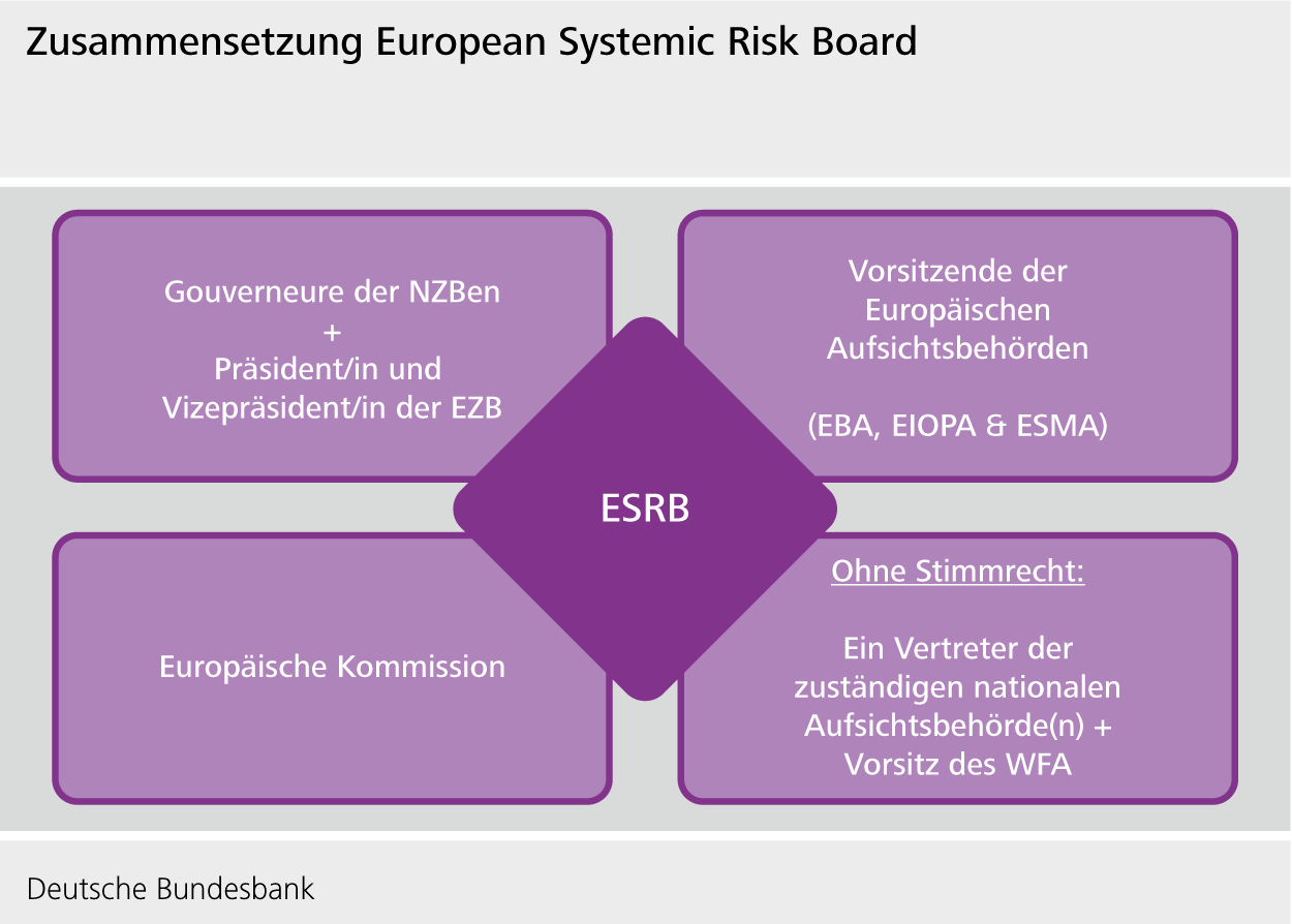 Diese Datei veranschaulicht in einer Grafik die Zusammensetzung des European Systemic Risk Board (ESRB). Die Infografik ist dem Buch "Geld- und Geldpolitik" entnommen. Sie steht im PNG-Format zur Verfügung, wodurch sie in viele Dokumentformate eingefügt werden kann.