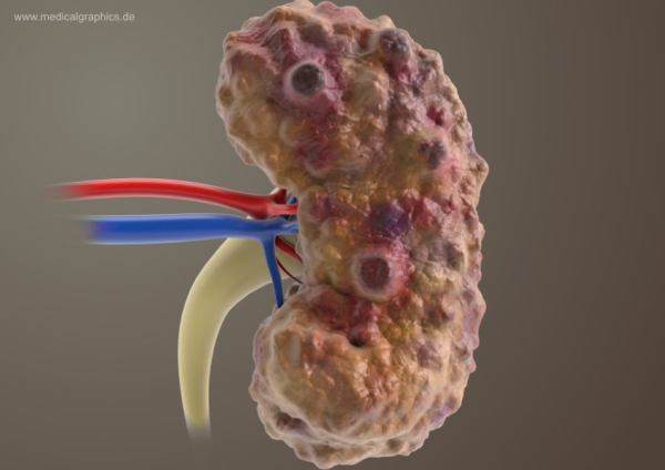 Illustration einer polyzystischen Niere (Polycystic Kidney Disease,PKD). Darstellung der äußerlichen Veränderungen des Nierenparenchym mit zahllosen Zysten.